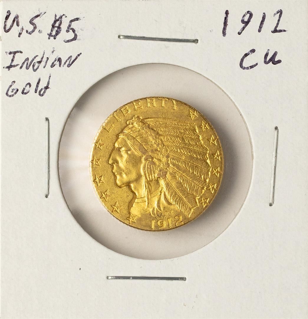 One 1912 $5 Indian Head Half Eagle Gold Coin.