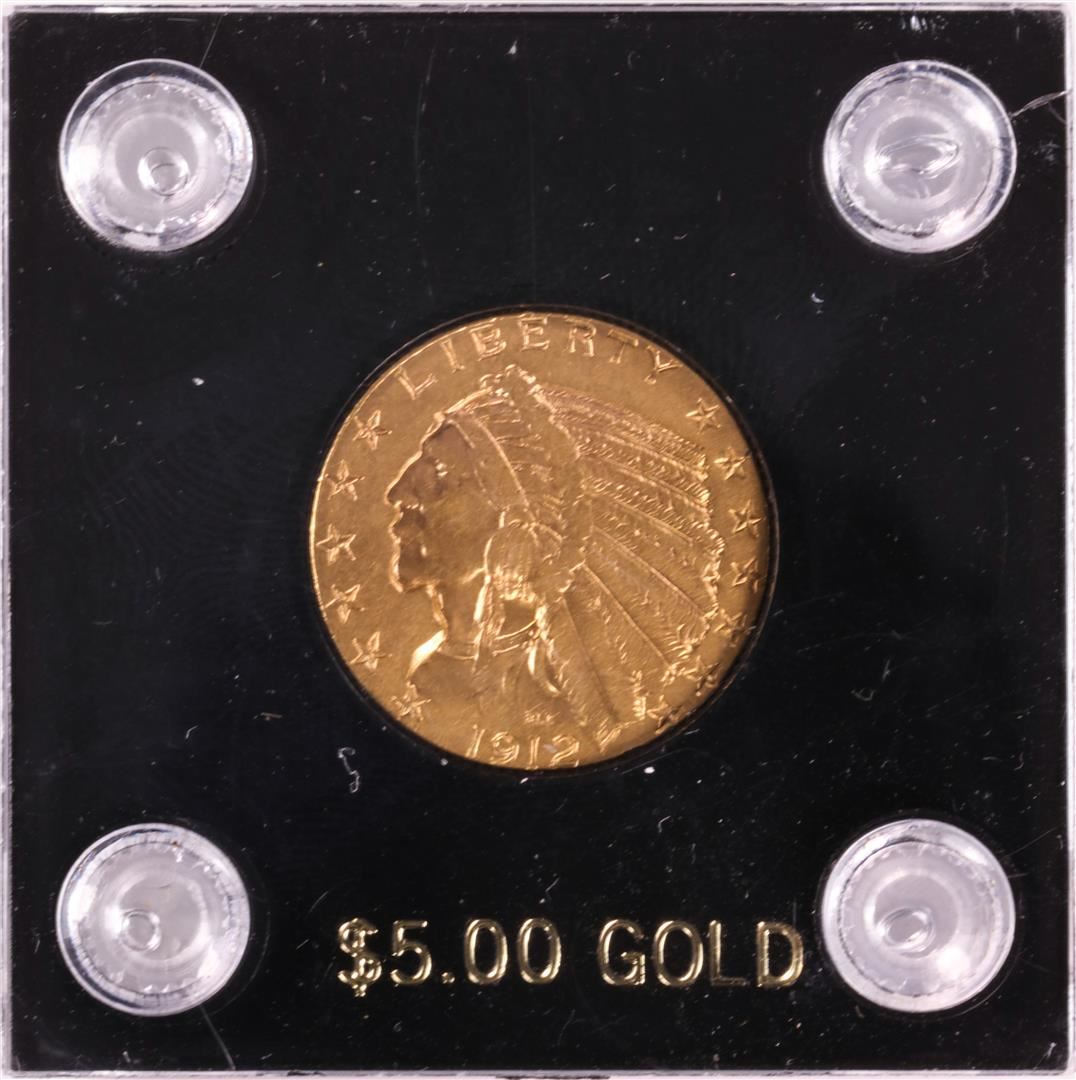 One 1912 $5 Indian Head Half Eagle Gold Coin.
