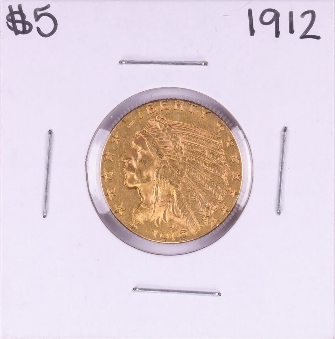One 1912 $5 Indian Head Half Eagle Gold Coin.