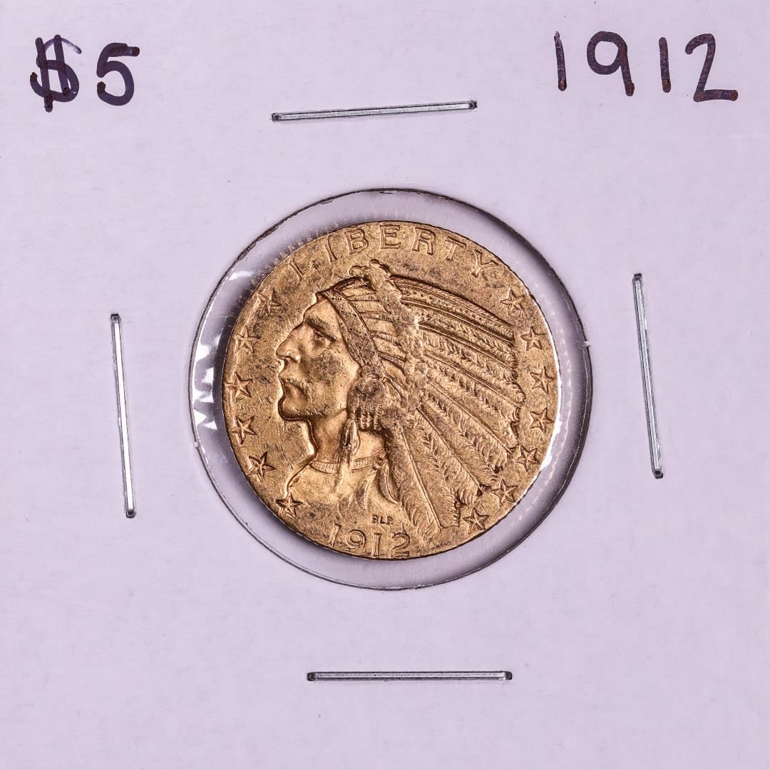 One 1912 $5 Indian Head Half Eagle Gold Coin.