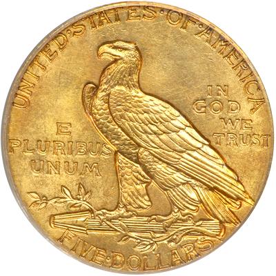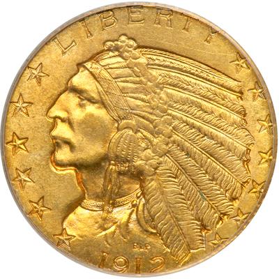 1912 $5 Indian. PCGS graded MS-64. Lovely golden toning. Flowing rivers of golden frost from edge to edge as on several others from this consignment. An aesthetically appealing coin. Pop 417; 45 in 65. (PCGS # 8523).
