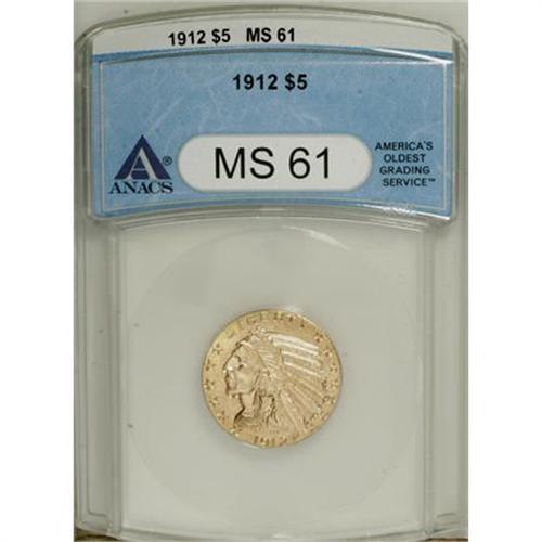 <B>1912 $5 MS61 ANACS.</B></I> NGC Census: (1490/3118). PCGS Population (730/2971). Mintage: 790,000. Numismedia Wsl. Price for NGC/PCGS coin in MS61: $535. (#8523)<BR><BR><B>Coin Engraver:</B> Bela Lyon Pratt<BR><BR><b>Shipping:</b> Coins & Currency (<a target="_blank" href="http://www.heritageauctions.com/common/shipping.php">view shipping information</a>)