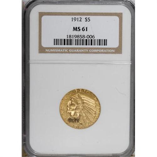 <B>1912 $5 MS61 NGC.</B></I> NGC Census: (1478/3096). PCGS Population (712/2865). Mintage: 790,000. Numismedia Wsl. Price for NGC/PCGS coin in MS61: $590. (#8523)<BR><BR><b>Shipping:</b> Coins & Currency (<a target="_blank" href="http://www.heritageauctions.com/common/shipping.php">view shipping information</a>)