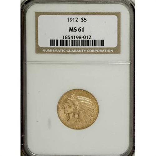 <B>1912 $5 MS61 NGC.</B></I> NGC Census: (1478/3096). PCGS Population (712/2865). Mintage: 790,000. Numismedia Wsl. Price for NGC/PCGS coin in MS61: $540. (#8523)<BR><BR><B>Coin Engraver:</B> Bela Lyon Pratt<BR><BR><b>Shipping:</b> Coins & Currency (<a target="_blank" href="http://www.heritageauctions.com/common/shipping.php">view shipping information</a>\)
