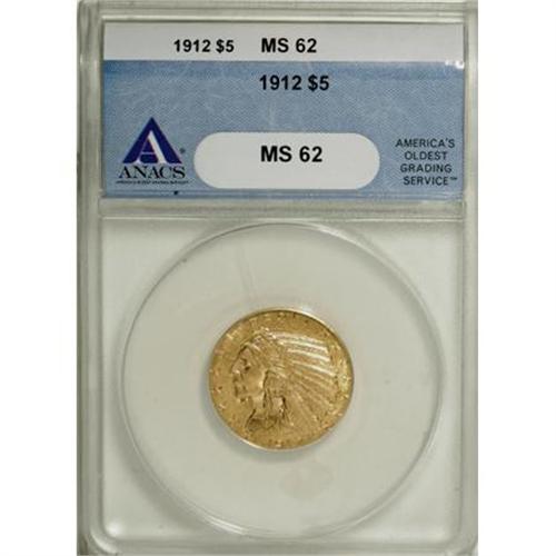 <B>1912 $5 MS62 ANACS.</B></I> NGC Census: (2191/944). PCGS Population (1751/1284). Mintage: 790,000. Numismedia Wsl. Price for NGC/PCGS coin in MS62: $1,150. (#8523)<BR><BR><B>Coin Engraver:</B> Bela Lyon Pratt<BR><BR><b>Shipping:</b> Coins & Currency (<a target="_blank" href="http://www.heritageauctions.com/common/shipping.php">view shipping information</a>)