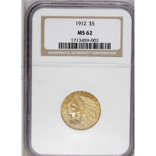 <B>1912<$5> MS62 NGC.</B></I> A satiny piece, predominantly orange-gold on the obverse with more red on the reverse. Typically struck with scattered marks on both sides.