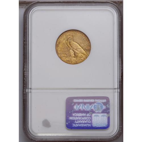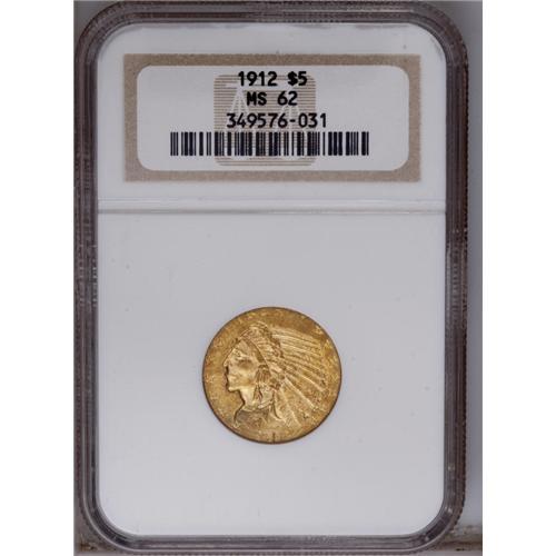 <B>1912<$5> MS62 NGC.</B></I> Crisp design details and deep reddish-golden toning are evident on each side of this lustrous example. A tiny grease stain (as struck) on the Indian's upper lip and a few wispy marks in the reverse fields limit the grade.