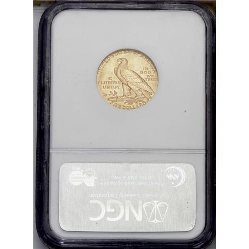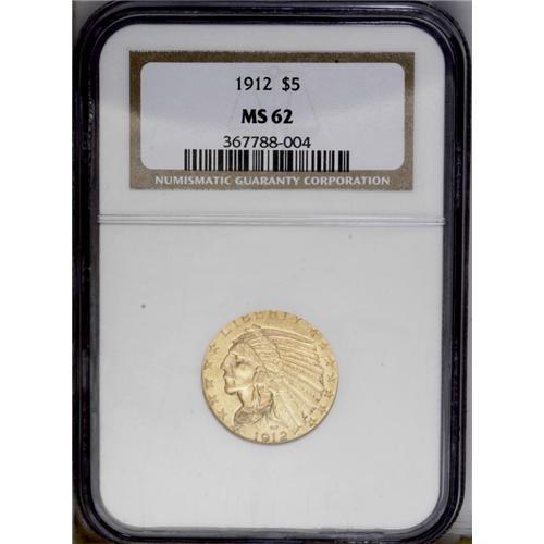 <B>1912<$5> MS62 NGC.</B></I> Satiny luster and pleasing color grace each side of this Mint State example. Typically struck with a superficial abrasion to the left of the Indian's face that affects the grade.