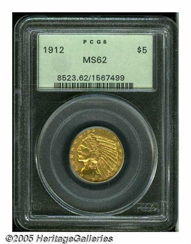 <B>1912<$5> MS62 PCGS.</B></I> A suitably struck and shimmering example with alternating steel-blue and honey colors. A moderate mark separates the first two stars. Housed in a green label holder.