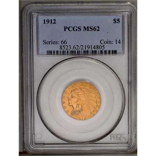 <B>1912<$5> MS62 PCGS.</B></I> The attractive coloration is subtly variegated on both sides, with reddish-copper and pale green-gold accents noted. A handful of grade-limiting blemishes are divided between obverse and reverse.