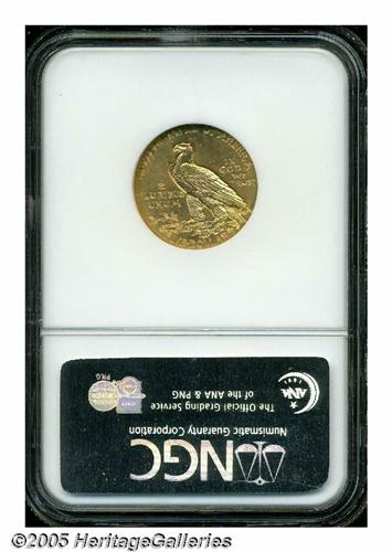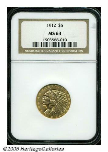 <B>1912<$5> MS63 NGC.</B></I> Lustrous surfaces display a deep brass-gold color and sharply struck design elements. Some light handling marks in the exposed fields limit the grade