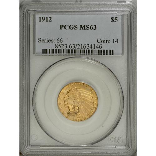 <B>1912 $5 MS63 PCGS.</B></I> A whisper of toning obscures some of the luster, but the overall quality of the coin is undeniable. This piece is also exceptionally well struck for an Indian half eagle, of any date. A small number of scattered, minuscule surface marks limit the grade but not the eye appeal.<BR><I>From The Dr. Eugene Cherny Collection of $5 and $10 Indians.</B></I><BR><BR><b>Shipping:</b> Coin/Currency (<a target="_blank" href="http://www.heritageauctions.com/common/shipping.php">view shipping information</a>)
