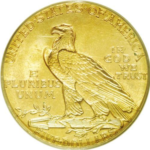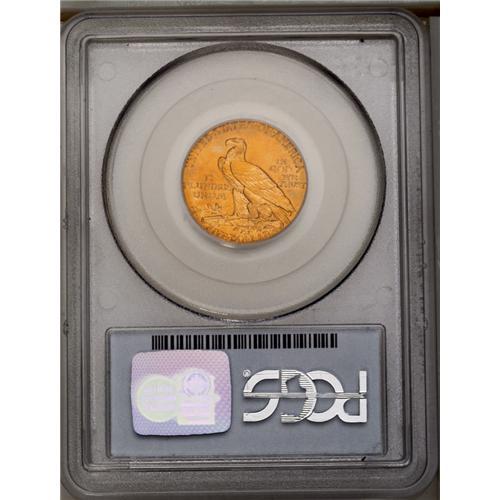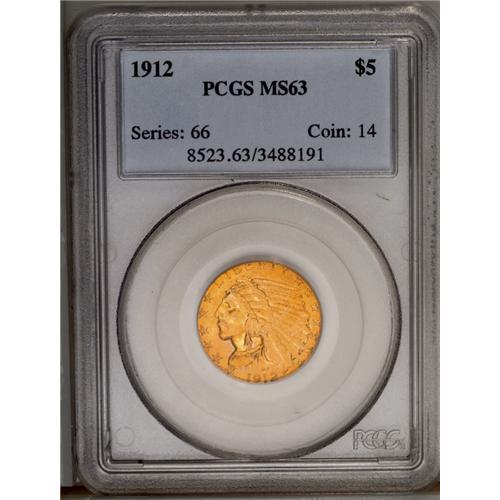 <B>1912<$5> MS63 PCGS.</B></I> Extraordinary eye appeal with deep honey-gold color and satiny luster. Both sides appear to be fully struck without any signs of weakness. This date is one of the common issues in the Indian half eagle series. The present beauty is an excellent choice for the type collector, or maybe for a birthyear set.