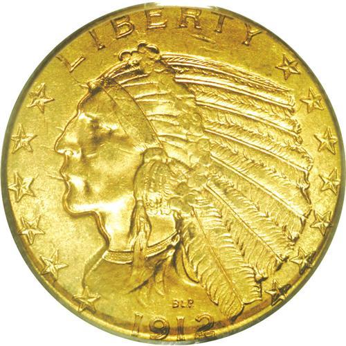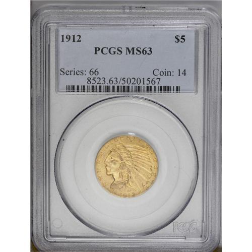 <B>1912<$5> MS63 PCGS.</B></I> Sharply struck and totally original with rich copper-red and steel-green toning noted on the reverse. Typically abraded for the grade and an excellent type coin.
