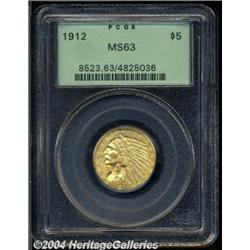<B>1912<$5> MS63 PCGS.</B></I> Rich golden color is accented with pink in the crevices and protected areas. Fairly well struck and only lightly marked on the obverse. <BR><BR><B>Important notice:</B> Heritage usually auctions material at the rate of 200-250 lots per hour. On some occasions eBay Live bid software or the Internet may not be able to keep up with the pace of the auction. We recommend placing a realistic absentee bid now as insurance to avoid disappointment. Occasionally the auctioneer may eliminate or reject an eBay Live bid, and the auctioneer may also reopen a lot after the close of the eBay live bidding (usually because we missed an audience bid), and may reject your bid even if it shows you as the winning bidder. By bidding via eBay Live, you agree that Heritage may award the lot to another bidder at its sole discretion under the circumstances described above or any other reasonable circumstances. Since eBay bids are not shown to us until we open the lot on the floor, we treat those bids just like floor bids. In most cases the floor responds before the eBay bid is presented to us, due to Internet lag time, so for consistency we have made it a policy that floor bids are always considered first over tie eBay live bids. Also please note that all Heritage lots purchased through eBay Live carry a 20% Buyer's Premium. Please make sure you read the Terms and Conditions before you bid.
