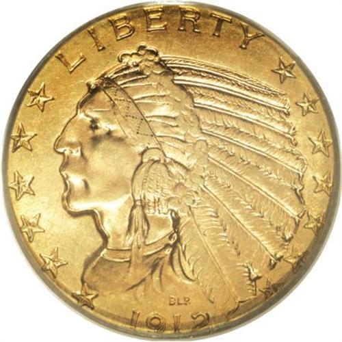 <B>1912 $5 MS63 PCGS.</B></I> A pleasing display of brassy-gold and steel-green coloration adorns the highly lustrous surfaces of this Select Mint State half eagle from the Philadelphia Mint. A shallow abrasion on the Indian's forehead and a few scattered field marks on the reverse preclude an even higher numerical grade assessment. <BR><BR><B>Coin Engraver:</B> Bela Lyon Pratt<BR><BR><b>Shipping:</b> Coins & Currency (<a target="_blank" href="http://www.heritageauctions.com/common/shipping.php">view shipping information</a>)