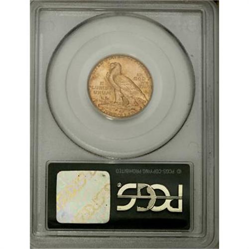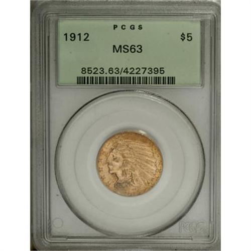 <B>1912 $5 MS63 PCGS.</B></I> Highly lustrous surfaces are covered in a mix of apricot and yellow-gold patina, with a light splash or two of bluish-green. A well directed strike brings out sharpness in the design elements. A few minute marks in the raised fields account for the Select grade. Housed in a green-label holder.<BR><BR><B>Coin Engraver:</B> Bela Lyon Pratt<BR><BR><b>Shipping:</b> Coins & Currency (<a target="_blank" href="http://www.heritageauctions.com/common/shipping.php">view shipping information</a>)