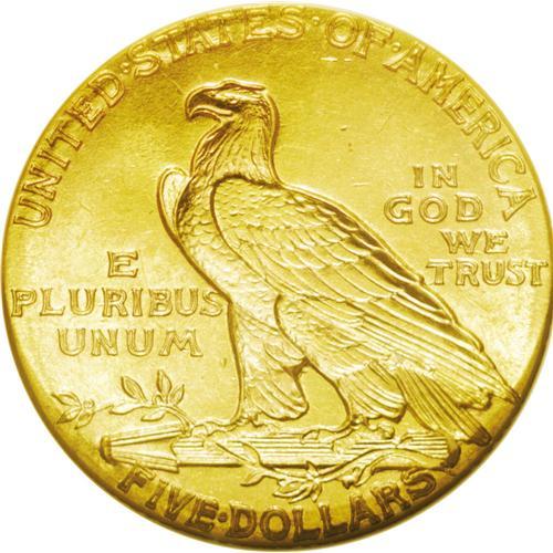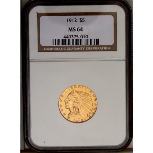<B>1912<$5> MS64 NGC.</B></I> MS64 Indian half eagles represent an excellent blend of quality and affordability for many collectors, as the certified populations dwindle from three digits to two digits at the jump from MS64 to MS65--and the prices increase from four digits to five digits! This near-Gem specimen offers a bold strike and largely pristine honey-gold surfaces. Minor contact marks seen only under a loupe separate it from the Gem level. NGC has graded 38 pieces finer (5/06).