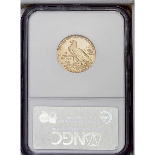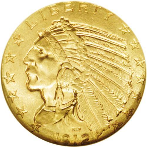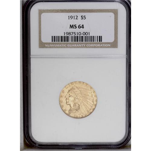 <B>1912<$5> MS64 NGC.</B></I> This type is very challenging to locate in better grades as the incuse design exposes the fields to abrasions first. This coin shows a couple of field marks that prevent a higher grade, but all in all this is a very pleasing example and one that has rich copper-golden surfaces and satiny mint luster.