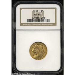 <table><tr><td><TABLE cellSpacing=0 cellPadding=0 width="100%" bgColor=#000000 border=0><TBODY> <TR><TD width="100%"><TABLE cellSpacing=1 cellPadding=3 width="100%" border=0><TBODY><TR><TD width="100%" bgColor=#79735c><FONT face=arial color=#ffffff size=3><B>Description</B> </FONT></TD></TR><TR><TD width="100%" bgColor=#ffffff><FONT face=arial size=2><B>1912 $5 MS64 NGC.</B></I> This type is very challenging to locate in better grades as the incuse design exposes the fields to abrasions first. This coin shows a couple of field marks that prevent a higher grade, but all in all this is a very pleasing example and one that has rich reddish-orange surfaces and satiny mint luster. </FONT></TD></TR></TBODY></TABLE></TD></TR></TBODY></TABLE><BR><A name=PricesRealized></A><TABLE cellSpacing=0 cellPadding=0 width="100%" bgColor=#000000 border=0><TBODY><TR><TD width="100%"><TABLE cellSpacing=1 cellPadding=3 width="100%" border=0><TBODY><TR><TD width="100%" bgColor=#79735c><A name=PR><FONT face=arial color=#ffffff size=3><B>Previous Prices from Heritage Auctions</B> </FONT></A></TD></TR><TR><TD bgColor=#f6f6ed><TABLE cellSpacing=0 cellPadding=0 width="100%" border=1><TBODY><TR><TD align=middle width="33%"><B>Date</B></TD><TD align=middle width="33%"><B>Service</B></TD><TD align=middle width="33%"><B>Price</B></TD></TR><TR bgColor=whitesmoke><TD width="33%"><B>01/11/2003</B></TD><TD width="33%">NGC</TD><TD width="33%">$3,450.00</TD></TR><TR bgColor=whitesmoke><TD width="33%"><B>04/05/2001</B></TD><TD width="33%">PCGS</TD><TD width="33%">$6,037.50</TD></TR><TR bgColor=whitesmoke><TD width="33%"><B>10/06/2000</B></TD><TD width="33%">PCGS</TD><TD width="33%">$2,990.00</TD></TR><TR bgColor=whitesmoke><TD width="33%"><B>05/05/2000</B></TD><TD width="33%">PCGS</TD><TD width="33%">$3,335.00</TD></TR><TR bgColor=whitesmoke><TD width="33%"><B>08/13/1999</B></TD><TD width="33%">PCGS</TD><TD width="33%">$2,990.00</TD></TR><TR bgColor=whitesmoke><TD width="33%"><B>08/13/1999</B></TD><TD width="33%">PCGS</TD><TD width="33%">$3,737.50</TD></TR><TR bgColor=whitesmoke><TD width="33%"><B>08/13/1999</B></TD><TD width="33%">ANACS</TD><TD width="33%">$6,900.00</TD></TR><TR bgColor=whitesmoke><TD width="33%"><B>06/06/1997</B></TD><TD width="33%">NGC</TD><TD width="33%">$3,910.00</TD></TR><TR bgColor=whitesmoke><TD width="33%"><B>03/16/1996</B></TD><TD width="33%">NGC</TD><TD width="33%">$4,730.00</TD></TR><TR bgColor=whitesmoke><TD width="33%"><B>03/16/1996</B></TD><TD width="33%">NGC</TD><TD width="33%">$4,840.00</TD></TR><TR bgColor=whitesmoke><TD width="33%"><B>01/01/2001</B></TD><TD width="33%">PCGS</TD><TD width="33%">$2,415.00</TD></TR><TR bgColor=whitesmoke><TD width="33%"><B>08/09/2000</B></TD><TD width="33%">NGC</TD><TD width="33%">$1,955.00</TD></TR><TR bgColor=whitesmoke><TD width="33%"><B>01/01/1994</B></TD><TD width="33%">NGC</TD><TD width="33%">$7,150.00</TD></TR><TR bgColor=whitesmoke><TD width="33%"><B>11/01/1993</B></TD><TD width="33%">PCGS</TD><TD width="33%">$5,775.00</TD></TR><TR bgColor=whitesmoke><TD width="33%"><B>10/01/1998</B></TD><TD width="33%">PCGS</TD><TD width="33%">$5,610.00</TD></TR><TR bgColor=whitesmoke><TD width="33%"><B>09/01/1999</B></TD><TD width="33%">PCGS</TD><TD width="33%">$4,600.00</TD></TR><TR bgColor=whitesmoke><TD width="33%"><B>09/01/1998</B></TD><TD width="33%">PCGS</TD><TD width="33%">$4,140.00</TD></TR><TR bgColor=whitesmoke><TD width="33%"><B>01/01/1995</B></TD><TD width="33%">PCGS</TD><TD width="33%">$3,960.00</TD></TR><TR bgColor=whitesmoke><TD width="33%"><B>01/01/1999</B></TD><TD width="33%">PCGS</TD><TD width="33%">$3,910.00</TD></TR><TR bgColor=whitesmoke><TD width="33%"><B>01/01/1995</B></TD><TD width="33%">PCGS</TD><TD width="33%">$3,520.00</TD></TR><TR bgColor=whitesmoke><TD width="33%"><B>09/01/1995</B></TD><TD width="33%">PCGS</TD><TD width="33%">$3,520.00</TD></TR></TBODY></TABLE></TD></TR><TR><TD bgColor=#ffffff><FONT face=arial size=1 ?>PLEASE NOTE: All prices realized reflect the final hammer price PLUS the buyer's premium in auctions that charge a buyer's premium. Each item has a notation at the top of the listing indicating whether that lot included a buyer's premium. Example: A item that sells with a final hammer price of $100 and a 20% buyer's premium will display with a price realized of $120. All information listed is intended to be as accurate as possible, but errors are possible. Please use this guide carefully and inform us of any inaccuracies. </FONT></TD></TR></TBODY></TABLE></TD></TR></TBODY></TABLE><BR><TABLE cellSpacing=0 cellPadding=0 width="100%" bgColor=#000000 border=0><TBODY><TR><TD width="100%"><TABLE cellSpacing=1 cellPadding=3 width="100%" border=0><TBODY><TR><TD width="100%" bgColor=#79735c colSpan=6><FONT face=arial color=#ffffff size=3><B>Price Guide*</B> </FONT></TD></TR><TR bgColor=#f6f6ed><TD align=middle><B>Grade</B> </TD><TD align=middle><B>Coin World<BR>(Trends)</B> </TD><TD align=middle><B>Numismedia<BR>Retail</B> </TD><TD align=middle><B>Numismedia<BR>Wholesale</B> </TD><TD align=middle><B>Coin<BR>Universe</B> </TD><TD align=middle><B>Heritage<BR>Value Index</B> </TD></TR><TR bgColor=#ffffff><TD align=middle>63</TD><TD align=right>$1,125.00</TD><TD align=right>---</TD><TD align=right>$1,020.00</TD><TD align=right>$1,350.00</TD><TD align=right>$945.13</TD></TR><TR style="FONT-WEIGHT: bold" bgColor=#cccfdd><TD align=middle>64</TD><TD align=right>$3,600.00</TD><TD align=right>---</TD><TD align=right>$2,550.00</TD><TD align=right>$3,050.00</TD><TD align=right>$2,206.25</TD></TR><TR bgColor=#ffffff><TD align=middle>65</TD><TD align=right>$13,500.00</TD><TD align=right>---</TD><TD align=right>$9,450.00</TD><TD align=right>$13,500.00</TD><TD align=right>$8,895.00</TD></TR><TR bgColor=#ffffff><TD colSpan=6><FONT size=1>*All information listed is intended to be as accurate as possible, but errors are possible. No item may be returned or refused based on this information which is provided as a service to our customers. You should co