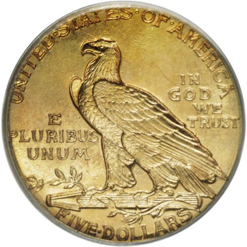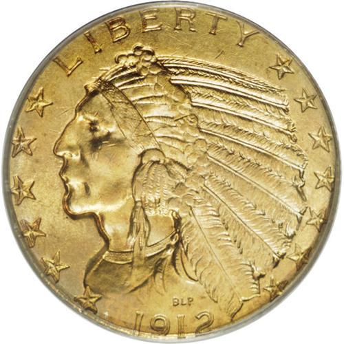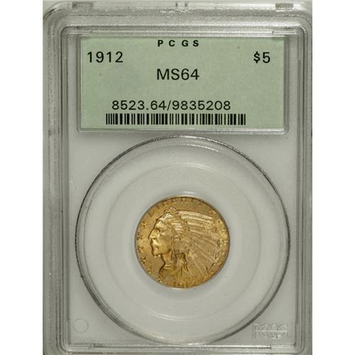 <B>1912 $5 MS64 PCGS.</B></I> The shining surfaces of this near-Gem are predominantly orange-gold, though a spot of lighter color appears at the right obverse and reverse. Solidly struck overall with only a handful of grade-limiting abrasions. An attractive example that is sure to attract the attention of discerning type collectors, housed in a green label holder.<BR><BR><b>Shipping:</b> Coins & Currency (<a target="_blank" href="http://www.heritageauctions.com/common/shipping.php">view shipping information</a>)