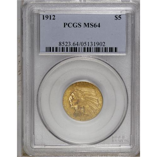 <B>1912<$5> MS64 PCGS.</B></I> This is a particularly attractive near-Gem example of the 1912 Indian Head half eagle. The coloration is deep and coppery-gold and orange, with delightful mint-green accents for added appeal. Well struck, lustrous, and carefully preserved, the coin only reveals a few pinpoint-sized marks under close inspection, indicating that its assigned grade level is a conservative one.