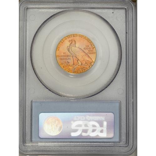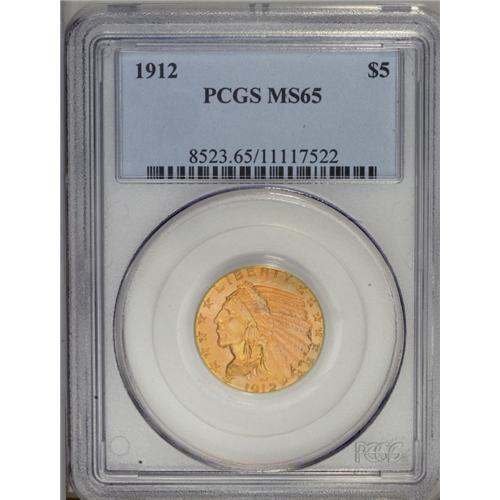 <B>1912<$5> MS65 PCGS.</B></I> A no-questions Gem, both sides are covered by a thin veneer of steel-blue and red-orange patina that leaves no doubt about this coin's originality. Some Indian half eagles are softly struck over the central features, but not this expertly produced survivor. The feathers in the Indian's headdress, as well as the eagle's trailing wing feathers, are as crisp as one could expect for the type. Both sides are awash in mint frost. From an aesthetic standpoint, this coin is one of the most beautiful 1912 half eagles that we have ever offered, and, as alluded to above, the technical merits are equally impressive. Conditionally rare, as are all issues in this 20th century gold series. Population: 37 in 65, none are finer (7/06).