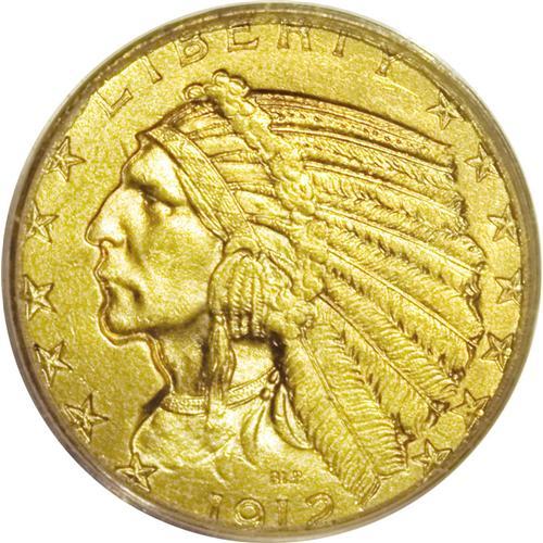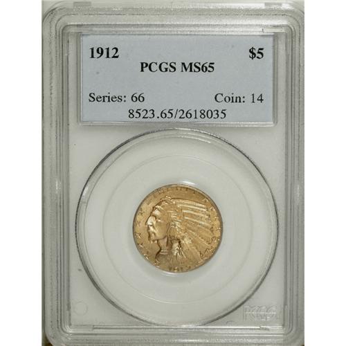 <B>1912 $5 MS65 PCGS.</B></I> Because of the conditional scarcity of Indian half eagles and the subsequent high prices these pieces command when offered at public auction, most collectors have rethought their collecting strategy and included MS64 coins rather than the Gems that might be sought in other series. The 1912 is one of the few issues of this type that is relatively available as a Gem. It is therefore a coin that can be used for type purposes as well. According to the November population data from both PCGS and NGC, a total of 74 coins have been certified in MS65, but only three are finer (all NGC). The fragile surfaces of this piece are barely abraded, and each side displays generous amounts of rose-gold and lilac patina with strong underlying mint frost. A well struck example of this so-called "common" date in the five dollar Indian series.<BR><I>From The Kutasi Collection.</B></I><BR><BR><b>Shipping:</b> Coin/Currency (<a target="_blank" href="http://www.heritageauctions.com/common/shipping.php">view shipping information</a>)