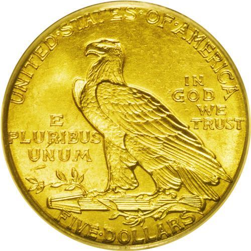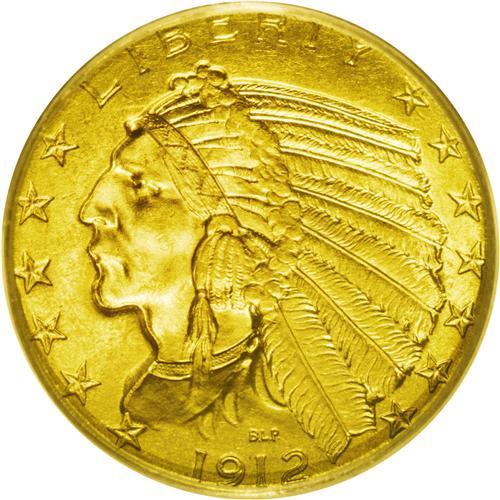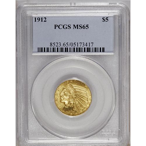 <B>1912<$5> MS65 PCGS.</B></I> This is a boldly impressed specimen that displays nearly complete details on the Indian's headdress and the eagle's shoulder feathers. The frosty surfaces exhibit an attractive green-gold cast with remarkably few abrasions. A small abrasion is evident just below UN on the lower reverse, and is the only distraction worthy of note. A solid Gem example of this conditionally scarce Indian Head issue. Population: 37 in 65, 0 finer (7/06).