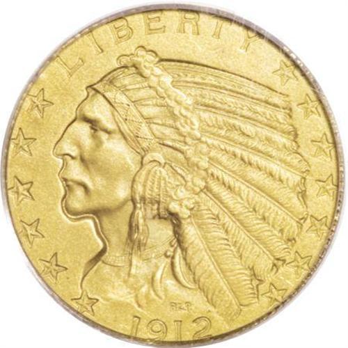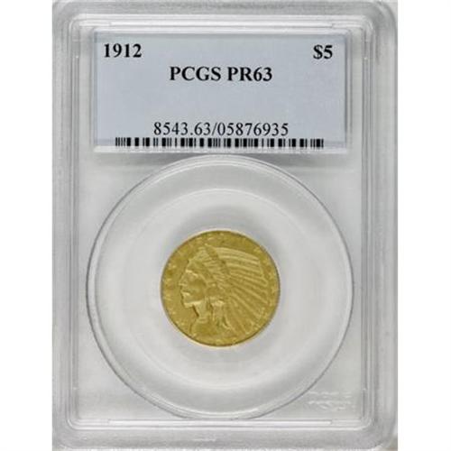 <B>1912 $5 PR63 PCGS.</B></I> Grading matte proofs is an inexact art, and attributes that are beneficial to other proofs are harmful in the context of these granular pieces. The surfaces are easily disturbed, leaving a shiny area; this is distracting to the matte proof connoisseur and lowers the grade. On the present coin, small areas of shine are noted at the right cheek, on the headband, and in the reverse fields; on that side, a handful of light hairlines also appear in the fields. The boldly impressed central devices of this fundamentally pleasing honey-gold example, however, are a definite plus. Population: 1 in 63, 29 finer (2/08).<BR><BR><B>Coin Engraver:</B> Bela Lyon Pratt<BR><BR><b>Shipping:</b> Coins & Currency (<a target="_blank" href="http://www.heritageauctions.com/common/shipping.php">view shipping information</a>)