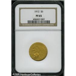 <B>1912 $5 PR65 NGC.</B></I> The Philadelphia mint reported 144 proof Half Eagles were minted in this year, but as expected, the number of survivors is far fewer than one might imagine from the mintage. Some catalogers in the past have claimed that perhaps as few as 15 separate pieces exist today, but we are convinced a larger number are actually extant, with perhaps as many as 40-50 pieces known. One can easily speculate that some were also melted in the mint or entered circulation.<BR> This is a fine looking matte proof that, when closely examined, shows thousands of tiny, sparkling granules. There are very few out-of-mint blemishes, the most obvious being a few scattered shiny spots that are confined to the reverse. While the texture of the surfaces is very similar to dates that precede and follow this one, the color is quite different with less of a green hue and a touch of red apparent. A pleasing example of this rare date. Lot:8715