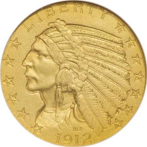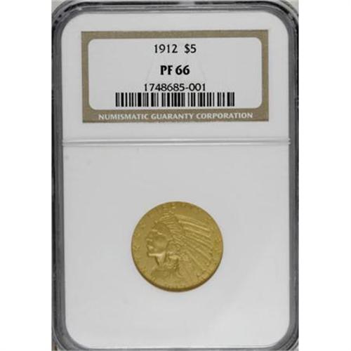 <B>1912 $5 PR66 NGC.</B></I> After the Mint returned to the matte process of proofing in 1911, the gold coins from 1912 continued this method of production. When one closely examines matte proof gold, it becomes apparent that year-to-year there were sometimes minute and sometimes large variations in the finish employed. This is more than likely from whom was in charge of sandblasting in that particular year, rather than a conscious decision about a particular finish for that year. This piece, like other 1912 matte proof gold coins shows a fine, sparkling granularity.<BR> Though official records give the mintage for the 1912 half eagle in matte finish as 144 proofs, the survival rate is low, though various authorities debate exactly how low. Gradually, estimates of 15 to 20 pieces have given way to higher ranges, though few believe the actual population consists of more than 40 specimens. (Population figures are obviously inflated by numerous submissions). Regardless of the real number of survivors, many of them appear in higher grades, with Gem proof as a baseline. This is a delightful Premium Gem example of an issue Heritage has offered just 12 times before, sharply struck with subtly shimmering, butterscotch-colored matte proof surfaces with just a hint of red added also. A few faint, light disturbances appear under magnification, but the delicate surfaces appear essentially untouched to the unaided eye. Census: 12 in 66, 17 finer (12/07).<BR><BR><B>Coin Engraver:</B> Bela Lyon Pratt<BR><BR><b>Shipping:</b> Coins & Currency (<a target="_blank" href="http://www.heritageauctions.com/common/shipping.php">view shipping information</a>)