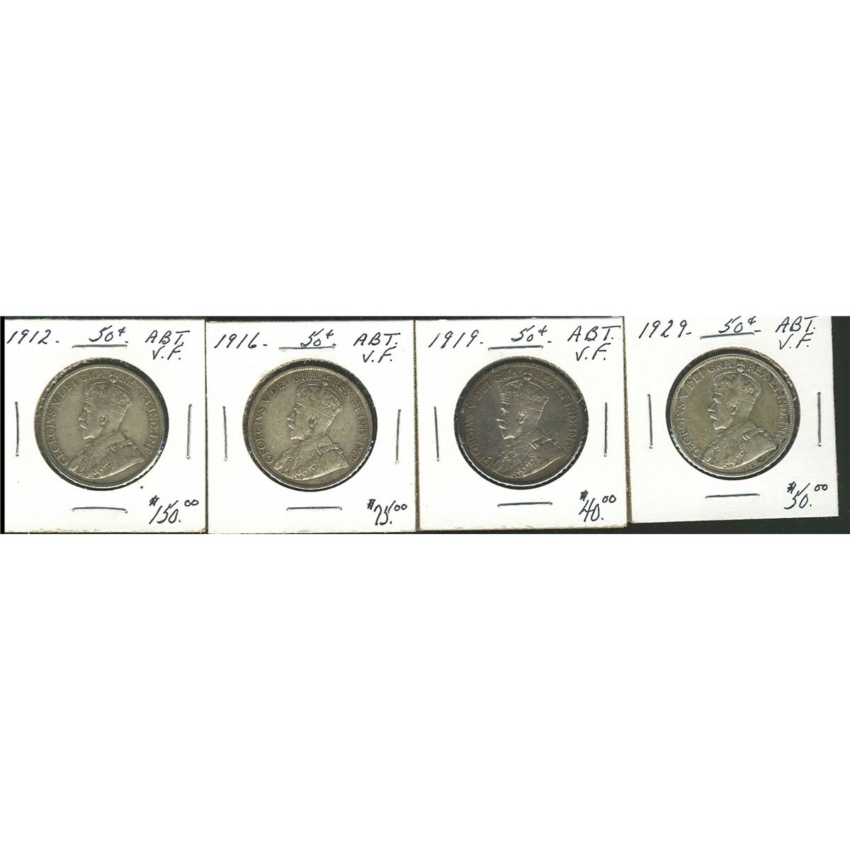 1912 50¢, 1916, 1919 & 1929. Lot of 4 coins all Abt VF. (PBA).