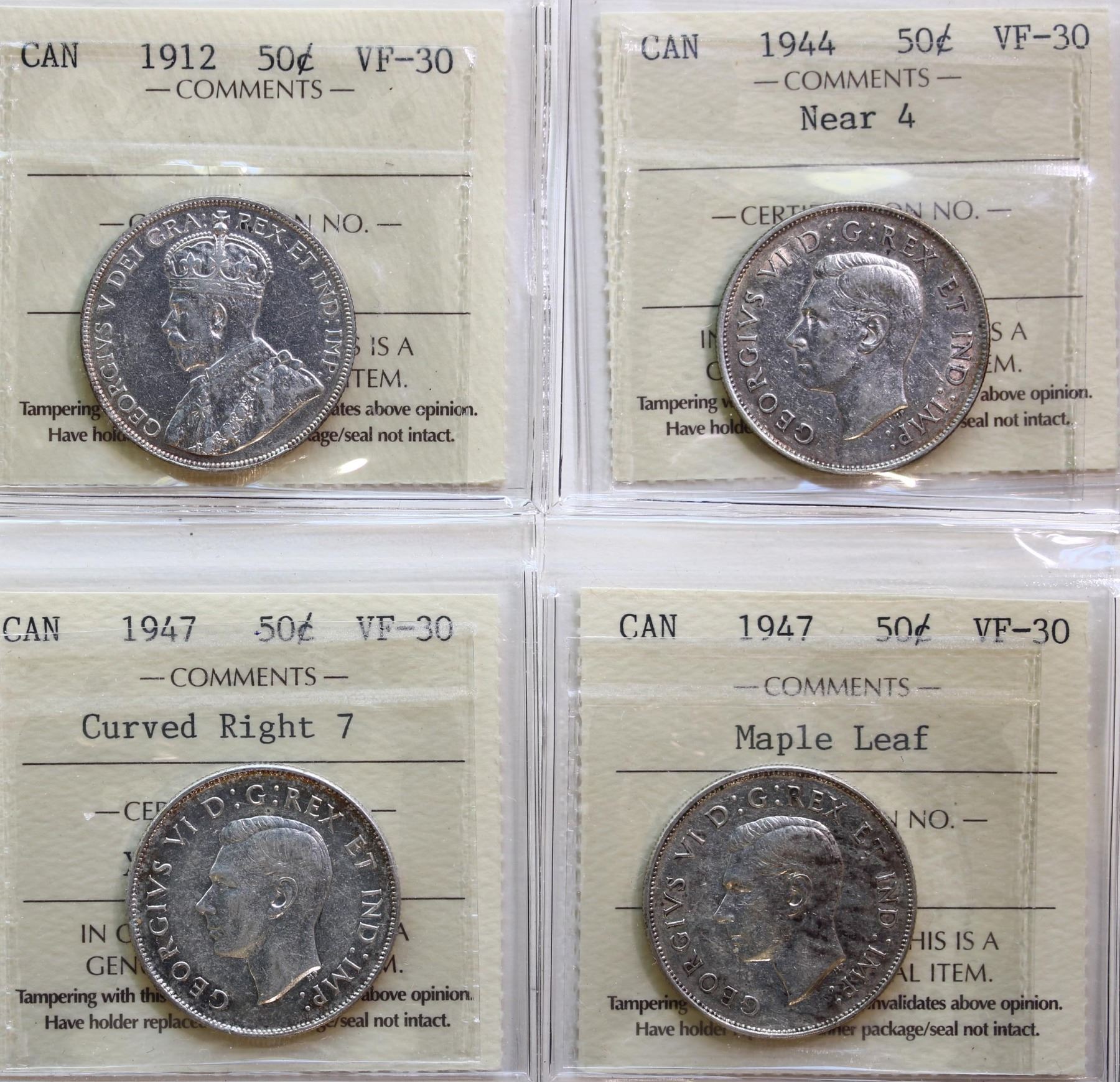 1912 50¢, 1944 "N4", 1947 "Curved Right 7", 1947 "ML", Lot of 4 coins all ICCS Choice Very Fine-30