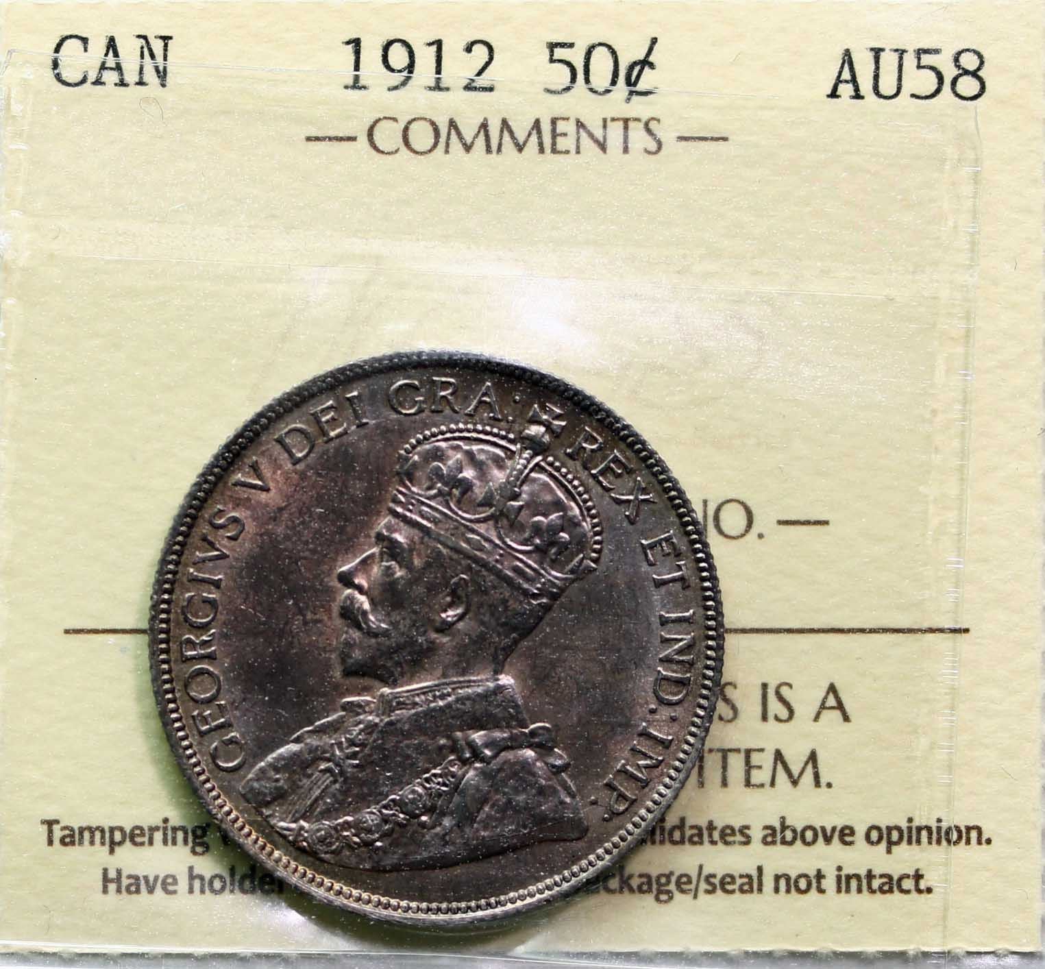 1912 50¢ ICCS Choice About Uncirculated-58 Lustrous example with attractive gold and purple tones. A nice example.