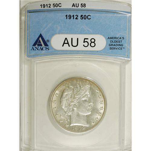 <B>1912 50C AU58 ANACS.</B></I> NGC Census: (46/358). PCGS Population (28/237). Mintage: 1,550,700. Numismedia Wsl. Price for NGC/PCGS coin in AU58: $292. (#6524)<BR><BR><b>Shipping:</b> Coins & Currency (<a target="_blank" href="http://www.heritageauctions.com/common/shipping.php">view shipping information</a>)