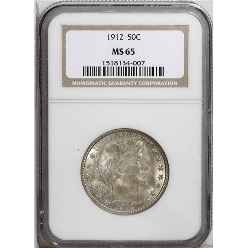 <B>1912<50C> MS65 NGC.</B></I> A pleasing satin finish shines from each side of this well struck, lightly toned example. A slight coating of speckled russet patina is noted on the obverse, and steel-blue undertones appear in the fields. Even though more than 1.5 million pieces were struck of the 1912 Barber half, there are remarkably few Gems available today. Census: 9 in 65, 0 finer (8/06).