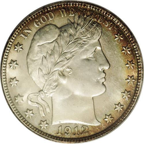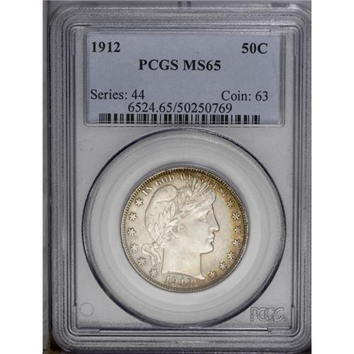 <B>1912<50C> MS65 PCGS.</B></I> Even though more than 1.5 million pieces were struck of the 1912 Barber half, there are remarkably few Gems available today. PCGS has only certified 11 other coins in this grade with two finer (1/06). This is a surprisingly lustrous example that is brilliant in the centers and surrounded by golden-red and green toning at the margins. A bit softly struck.<BR><I>From The Michael Casper Collection, Part Three.</B></I>