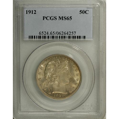 <B>1912 50C MS65 PCGS.</B></I> Largely untoned, with a light silver-gold cast on each side, this lovely Gem boasts a sharp strike save for the right (facing) shield corner and the eagle's claw nearby. Although more than 1.5 million were made, PCGS has certified only two coins finer of this issue (12/06).<BR><BR><b>Shipping:</b> Coin/Currency (<a target="_blank" href="http://www.heritageauctions.com/common/shipping.php">view shipping information</a>)