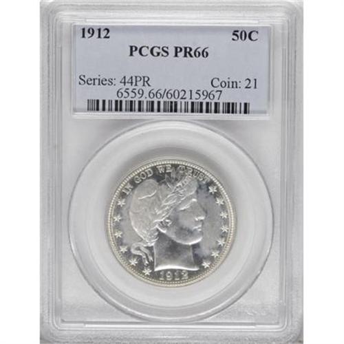 <B>1912 50C PR66 PCGS.</B></I> A faint milky patina occupies the obverse of this attractive Premium Gem Barber half dollar. The strike is bold throughout, and mild field-motif contrast is noted on both sides. An unobtrusive handling mark or two does not disturb. Population: 15 in 66, 5 finer (11/07).<BR><I>From The Kallenberg #1 PCGS Registry Set Of Proof Half Dollars.</B></I><BR><BR><B>Coin Engraver:</B> Charles E. Barber<BR><BR><b>Shipping:</b> Coins & Currency (<a target="_blank" href="http://www.heritageauctions.com/common/shipping.php">view shipping information</a>)