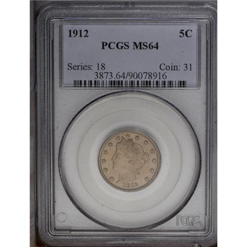 1912 5C MS64 PCGS. Frosty, subdued grayish toning with 1912[5C] MS64 PCGS.