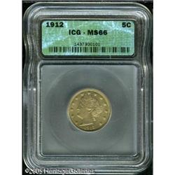 <B>1912 5C MS66 ICG.</B></I> A satiny Gem with rich yellow color and attractive iridescent toning. Bluntly struck on the hair, as well as the corn at the lower left of the reverse, typical of nearly all examples known today. Lot:5901