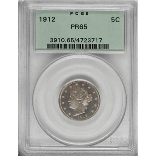 <B>1912 5C PR65 PCGS.</B></I> Delicate golden patina visits the portrait, while the rest of this gleaming Gem is predominantly nickel-white. A delightful representative of this final authorized proof Liberty nickel issue.<BR><BR><B>Coin Engraver:</B> Charles E. Barber<BR><BR><b>Shipping:</b> Coins & Currency (<a target="_blank" href="http://www.heritageauctions.com/common/shipping.php">view shipping information</a>)