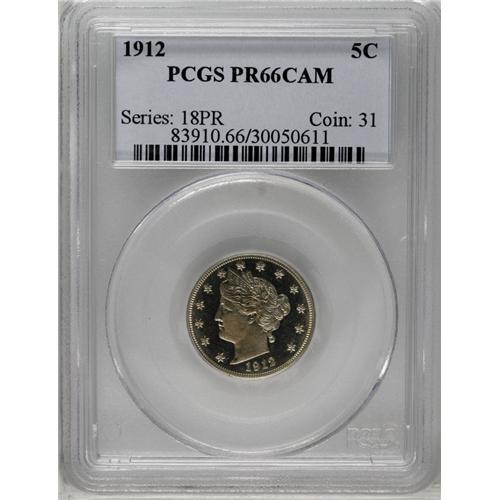 <B>1912<5C> PR66 Cameo PCGS.</B></I> A nice level of contrast between the frosty devices and mirrored fields. This is a well-struck specimen that has just a hint of gold toning over virtually flawless surfaces.