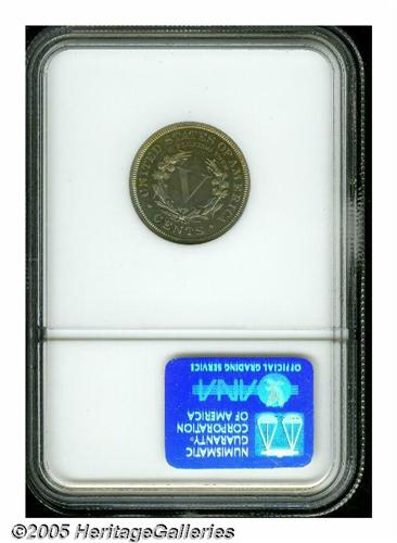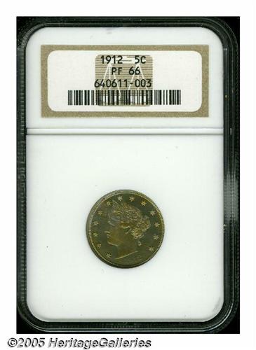 <B>1912<5C> PR66 NGC.</B></I> A slightly cameoed and remarkably well preserved proof, at least partially overlaid on each side in antique-golden and ice-blue hues. Remnants of an old spot are noticed to the right of star 5.