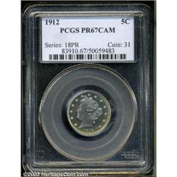 <TABLE cellSpacing=0 cellPadding=0 width="100%" bgColor=#000000 border=0><TBODY><TR><TD width="100%"><TABLE cellSpacing=1 cellPadding=3 width="100%" border=0><TBODY><TR><TD width="100%" bgColor=#79735c><FONT face=arial color=#ffffff size=3><B>Description</B> </FONT></TD></TR><TR><TD width="100%" bgColor=#ffffff><FONT face=arial size=2><B>1912 5C PR67 Cameo PCGS.</B></I> Nicely contrasted with surfaces that appear to be technically perfect, even when examined with a 16x loupe. Each side has varying amounts of ice-blue, golden, and rose colored toning that is enlivened by the bright, deeply reflective proof fields on each side. A true wonder coin. Anyone wanting to assemble a high quality collection of proof Liberty nickels needs to take a close look at this sale as we have two major consignments of exceptional quality pieces. </FONT></TD></TR></TBODY></TABLE></TD></TR></TBODY></TABLE><BR><A name=PricesRealized></A><TABLE cellSpacing=0 cellPadding=0 width="100%" bgColor=#000000 border=0><TBODY><TR><TD width="100%"><TABLE cellSpacing=1 cellPadding=3 width="100%" border=0><TBODY><TR><TD width="100%" bgColor=#79735c><A name=PR><FONT face=arial color=#ffffff size=3><B>Previous Prices from Heritage Auctions</B> </FONT></A></TD></TR><TR><TD bgColor=#f6f6ed><TABLE cellSpacing=0 cellPadding=0 width="100%" border=1><TBODY><TR><TD align=middle width="33%"><B>Date</B></TD><TD align=middle width="33%"><B>Service</B></TD><TD align=middle width="33%"><B>Price</B></TD></TR><TR bgColor=whitesmoke><TD width="33%"><B>07/29/2003</B></TD><TD width="33%">PCGS</TD><TD width="33%">$5,060.00</TD></TR><TR bgColor=whitesmoke><TD width="33%"><B>05/31/2003</B></TD><TD width="33%">NGC</TD><TD width="33%">$4,715.00</TD></TR></TBODY></TABLE></TD></TR><TR><TD bgColor=#ffffff><FONT face=arial size=1 ?>PLEASE NOTE: All prices realized reflect the final hammer price PLUS the buyer's premium in auctions that charge a buyer's premium. Each item has a notation at the top of the listing indicating whether that lot included a buyer's premium. Example: A item that sells with a final hammer price of $100 and a 20% buyer's premium will display with a price realized of $120. All information listed is intended to be as accurate as possible, but errors are possible. Please use this guide carefully and inform us of any inaccuracies. </FONT></TD></TR></TBODY></TABLE></TD></TR></TBODY></TABLE><BR><TABLE cellSpacing=0 cellPadding=0 width="100%" bgColor=#000000 border=0><TBODY><TR><TD width="100%"><TABLE cellSpacing=1 cellPadding=3 width="100%" border=0><TBODY><TR><TD width="100%" bgColor=#79735c colSpan=6><FONT face=arial color=#ffffff size=3><B>Price Guide*</B> </FONT></TD></TR><TR bgColor=#f6f6ed><TD align=middle><B>Grade</B> </TD><TD align=middle><B>Coin World<BR>(Trends)</B> </TD><TD align=middle><B>Numismedia<BR>Retail</B> </TD><TD align=middle><B>Numismedia<BR>Wholesale</B> </TD><TD align=middle><B>Coin<BR>Universe</B> </TD><TD align=middle><B>Heritage<BR>Value Index</B> </TD></TR><TR bgColor=#ffffff><TD align=middle>66</TD><TD align=right>---</TD><TD align=right>---</TD><TD align=right>---</TD><TD align=right>---</TD><TD align=right>---</TD></TR><TR style="FONT-WEIGHT: bold" bgColor=#cccfdd><TD align=middle>67</TD><TD align=right>---</TD><TD align=right>---</TD><TD align=right>---</TD><TD align=right>---</TD><TD align=right>---</TD></TR><TR bgColor=#ffffff><TD align=middle>68</TD><TD align=right>---</TD><TD align=right>---</TD><TD align=right>---</TD><TD align=right>---</TD><TD align=right>---</TD></TR><TR bgColor=#ffffff><TD colSpan=6><FONT size=1>*All information listed is intended to be as accurate as possible, but errors are possible. No item may be returned or refused based on this information which is provided as a service to our customers. You should contact each pricing source directly to determine the accuracy of this information. </FONT></TD></TR></TBODY></TABLE></TD></TR></TBODY></TABLE><BR><TABLE cellSpacing=0 cellPadding=0 width="100%" bgColor=#000000 border=0><TBODY><TR><TD width="100%"><TABLE cellSpacing=1 cellPadding=3 width="100%" border=0><TBODY><TR><TD width="100%" bgColor=#79735c><FONT face=arial color=#ffffff size=3><B>Population Guide</B> </FONT></TD></TR><TR bgColor=#ffffff><TD align=middle><!-- Begin Output of Population Grid--><TABLE cellSpacing=0 cellPadding=0 width="100%" border=0><TBODY><TR><TD vAlign=center><TABLE cellSpacing=0 width="100%" border=1 cellsadding="3"><TBODY><TR><TD vAlign=center><TABLE cellSpacing=0 cellPadding=3 width="100%" border=1><TBODY><TR><TD vAlign=center align=middle bgColor=#f0f1e8 colSpan=2 <CENTER><FONT face=Arial size=2><B>PCGS Pop </B></FONT><CENTER></CENTER></TD><TD vAlign=center align=middle bgColor=#f0f1e8 colSpan=2><CENTER><FONT face=Arial size=2><B>NGC Pop</B></CENTER></FONT></TD></TR><TR><TD vAlign=center><FONT face=Arial size=2>(67)</FONT> </TD><TD vAlign=center align=right><FONT face=Arial size=2>0</FONT> </TD><TD vAlign=center><FONT face=Arial size=2>(67)</FONT> </TD><TD vAlign=center align=right><FONT face=Arial size=2>3</FONT> </TD></TR><TR><TD vAlign=center><FONT face=Arial size=2>(>67)</FONT> </TD><TD vAlign=center align=right><FONT face=Arial size=2>0</FONT> </TD><TD vAlign=center><FONT face=Arial size=2>(>67)</FONT> </TD><TD vAlign=center align=right><FONT face=Arial size=2>0</FONT> </TD></TR></TBODY></TABLE></TD></TR></TBODY></TABLE></TD></TR></TBODY></TABLE><!-- End Output of Population Grid--> Important notice: Heritage usually auctions material at the rate of 200-250 lots per hour. On some occasions eBay Live bid software or the Internet may not be able to keep up with the pace of the auction. We recommend placing a realistic absentee bid now as insurance to avoid disappointment. Occasionally the auctioneer may eliminate or reject an eBay Live bid, and the auctioneer may also reopen a lot after the close of the eBay live bidding (usually because we missed an audience bid), and may reject your bid even if it shows you as the winning bidder. By bidding via e