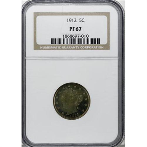 <B>1912 5C PR67 NGC.</B></I> Cherry-red and sun-gold compete for territory across this meticulously struck and penetratingly struck Superb Gem. A colorful and nearly carbon-free representative from the final collectible year of the Charles Barber type. Census: 19 in 67, 4 finer (11/07).<BR><BR><B>Coin Engraver:</B> Charles E. Barber<BR><BR><b>Shipping:</b> Coins & Currency (<a target="_blank" href="http://www.heritageauctions.com/common/shipping.php">view shipping information</a>)