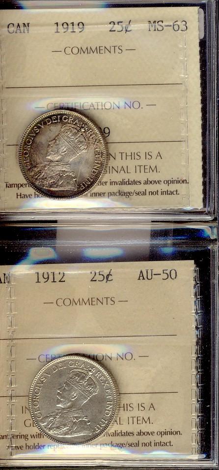1912 AU50 & 1919 MS63 25¢. Lot of 2 coins bith ICCS graded.