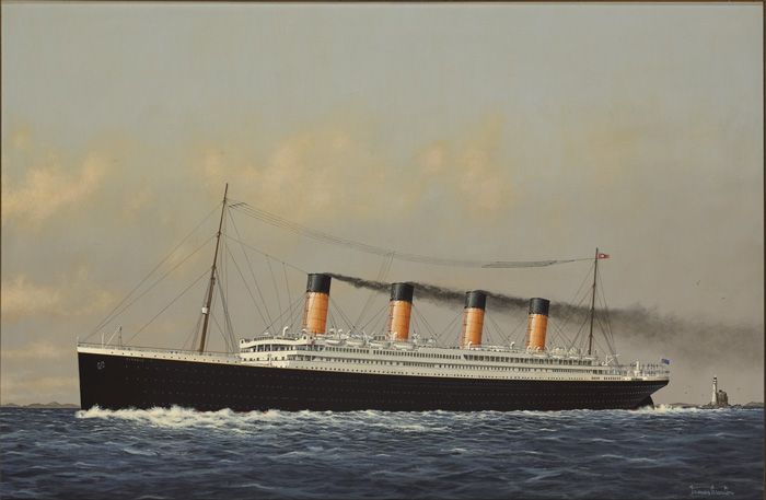 Oil on canvas painting of R.M.S. Titanic passing Fastnet Rock Lighthouse on her maiden voyage in 1912, attractively framed. Painted by James Morton an artist and illustrator renowned for the historical accuracy of his maritime and aviation scenes and whose works are much sought after. A similar painting by the same artist was sold by Whyte's in April 2012. This example however shows the famous ship in a different position, closer to the shore and with the Fastnet more prominent. Together with a copy of an Irish Times article from 1987 showing the artist and painting.