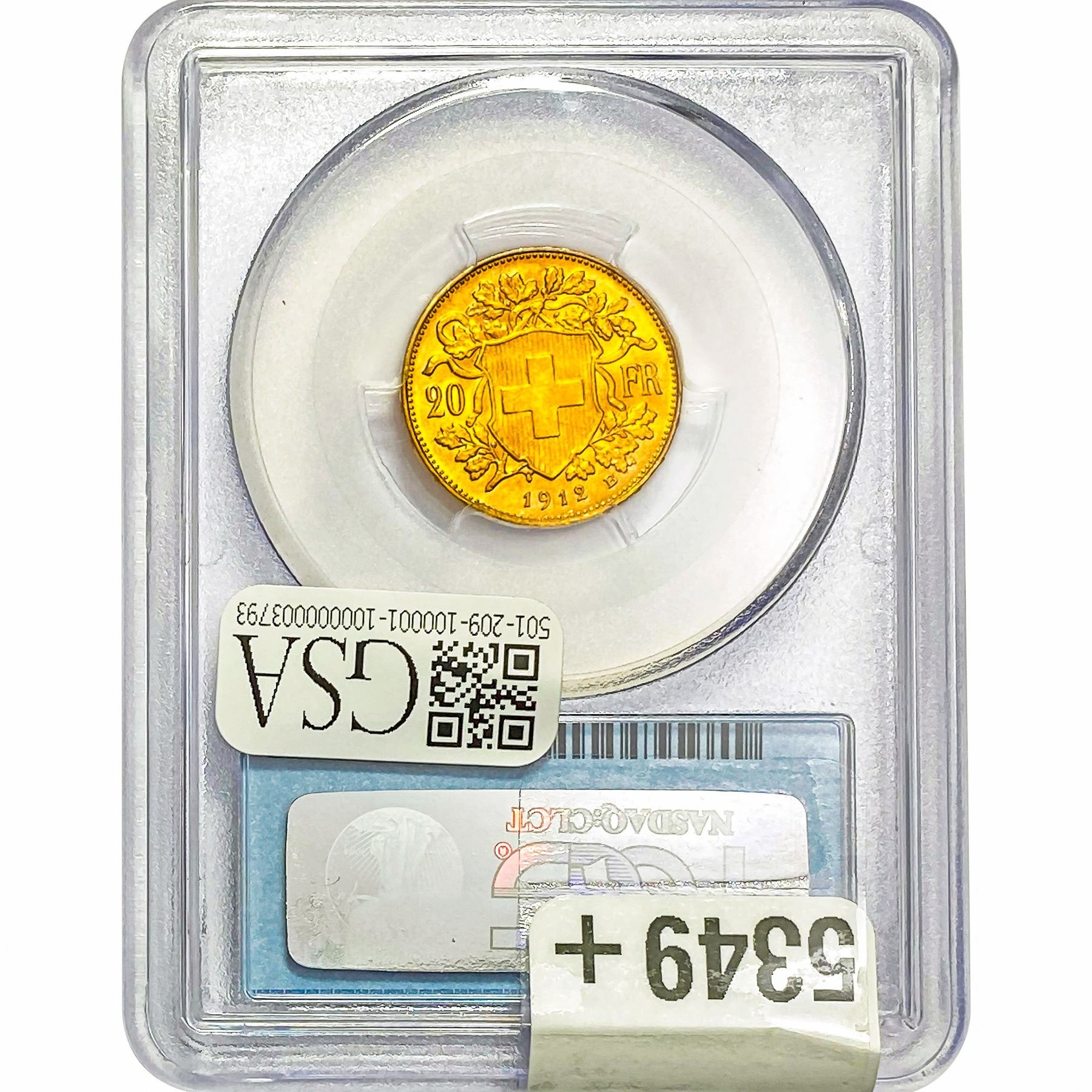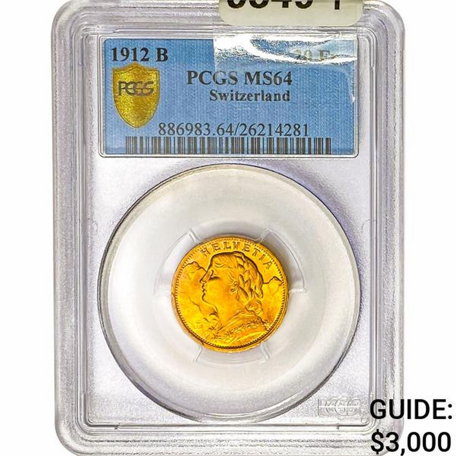 1912 B Switzerland .186oz Gold 20 Francs PCGS MS64
